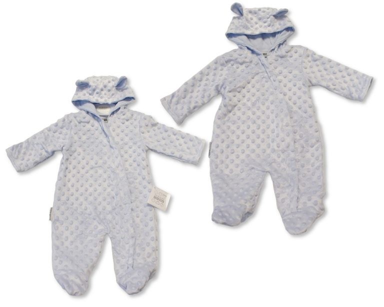Baby Dotted Velour All in One Pram suit with Hood and Ears – Blue 0-3months