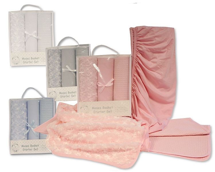 Ensure your baby sleeps in comfort from day one with this 3-piece Moses Basket starter set. The soft jersey fitted sheet provides a gentle surface for newborn skin, the waffle blanket delivers breathable warmth, and the rosebud blanket adds a charming finishing touch. Designed specifically for Moses baskets, this set combines practicality with style.